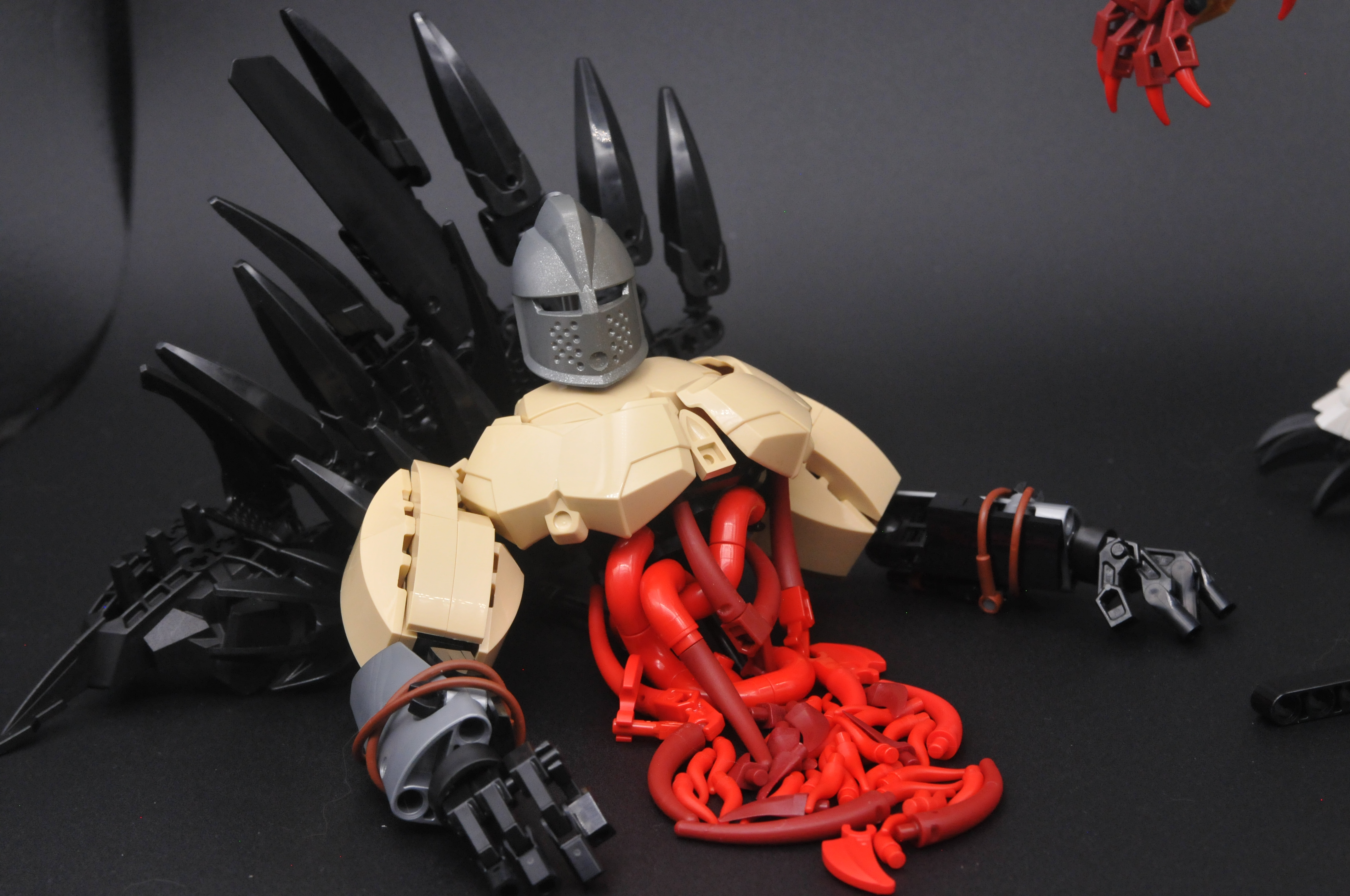 Once again it was all the rest that was a problem. A large head necessitates a large body, and I wanted it to be ripped, too, as a friend had recommended the Galian Beast as a good reference. Started with the chest just using the biggest parts I could find. Chest parts make for pretty good chests, even when doubled up. Big chest needed big abs, so big macs got the nod. Filling in the obliques took a little experimenting. The solution wasn't very elegant, but it was good enough. Dino tails have very pleasant curves.