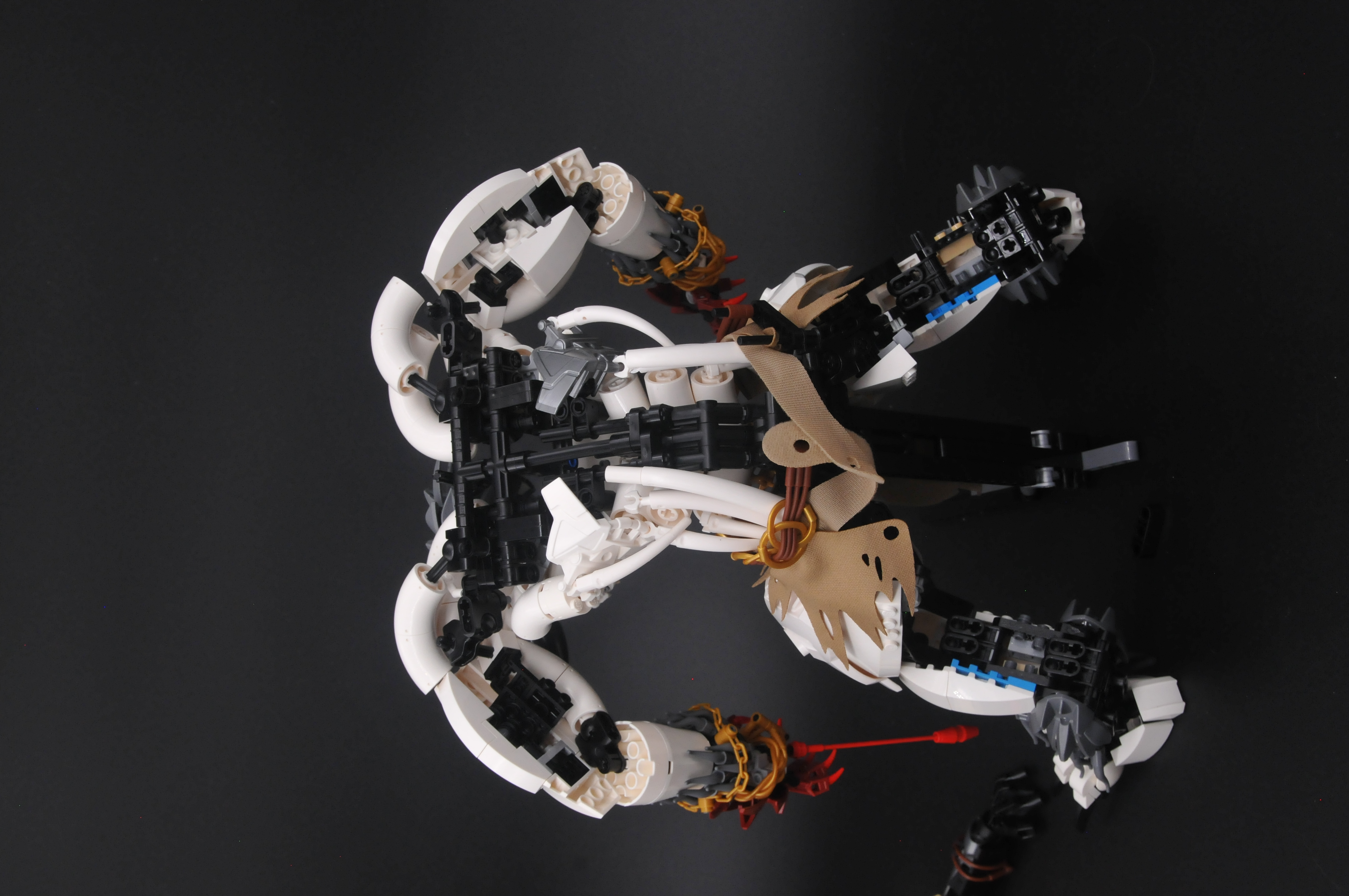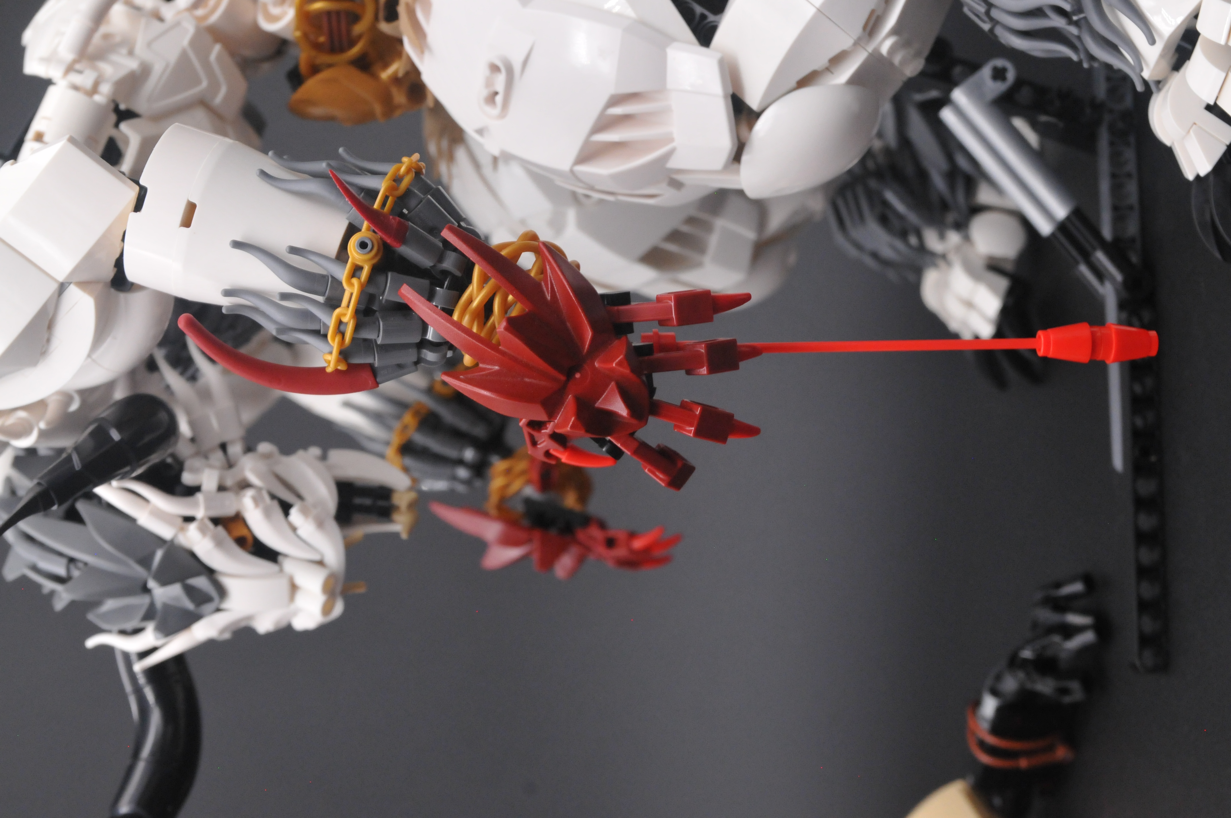 Distracted myself from the impending doom by working on the feet. Main thing to note here are the essential rubber tread attachments for traction. Then I moved back to the forearms. I had forgotten steering wheels have absolutely useless clutch so it did take a minute to figure out how to get the fur to stay in place, the secured gold chains being the solution I settled on (this was before the existence of the handy Sonic ring which has since done away with this clutch problem). I also took advantage of the jewelry idea to fill the massive wrist gap the steering wheels left me with. Added a quick hand design to round it out. I wanted meatier fingers but ran into trouble. Macaroni create too sharp an angle, I did not enjoy the pin holes in technic connectors, and more complicated solutions were more trouble than they were worth. A fight for another day.